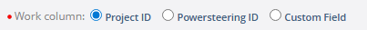 • Unique Project ID (required): A number used to identify the work item that the time is entered against. The ID entered into this field can be one of three things based on the "Work column" value of the Timesheet Loader Template used to import the file. "Work column" can have one of three values: