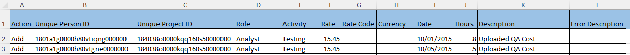 • Error Description: The cells in this column should be left empty; they will be populated by the Timesheet loader when errors occur. If any of the time entries fail, this column will display an explanation of the error in the error log.