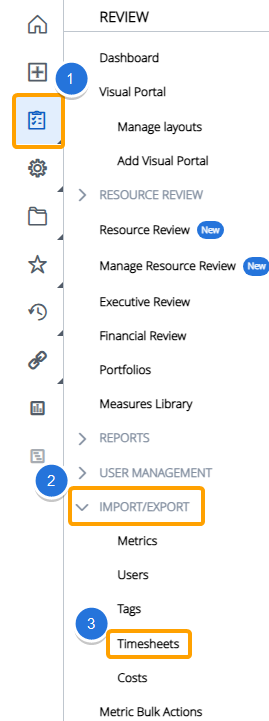 → Import/Export → Timesheets from the Navigation Menu.