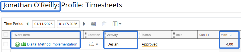 The "Unique Person Id" belongs to Jonathan O'Reilly, and the "Unique Project ID" belongs to the "Digital Method Implementation" project. The "Activity" has been set to "Design" and the date is January 12th, 2026.