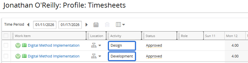 If we look at Jonathan's Timesheet for the week, we can see that there is already an entry for this project with this activity on the same day: