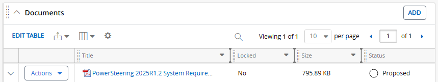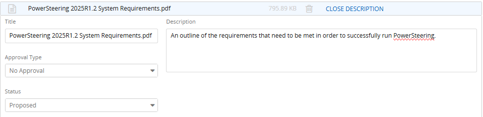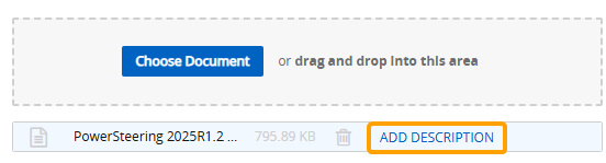 Documents, such as requirements, contracts, meeting notes, etc., can be directly attached to work items in PowerSteering. Adding relevant Documents to work items creates a centralized location for work-related files and URL links, which prevents Team Members from having to search through emails, shared drives, or other systems for certain information.