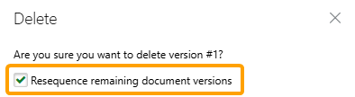 Use the "Resequence remaining document versions" checkbox to determine if the "Version" numbers of the remaining versions should be resequenced to reflect the new order or if they should keep their current "Version" numbers.