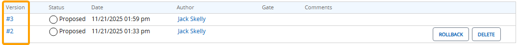A previous version of a Document can become the current version again using the rollback feature. When this occurs, the version selected for the rollback will be the current version that is displayed on the Summary page "Documents" module. Additionally, all of the versions added after the version selected for the rollback will be deleted.