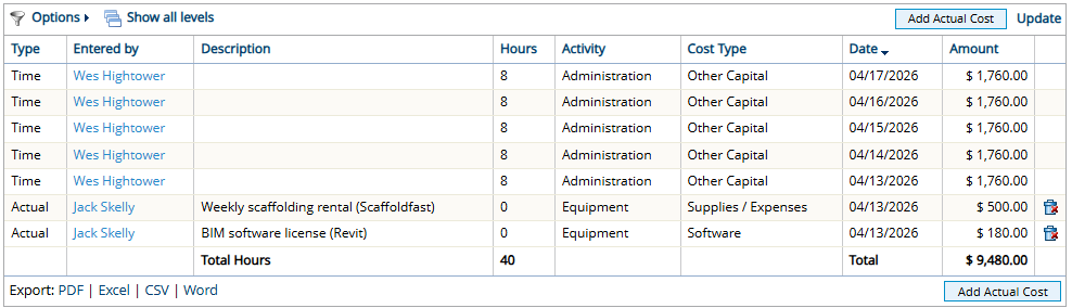 Note: To see the Actual Costs page, "Control Cost" must be enabled from the work item's Standard Details. Additionally, users require the "View Costs" Project Task permission on the work item to view the page.