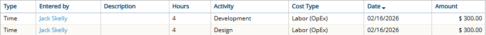 Actual Costs that appear as a result of approved time submitted toward the work item will display a "Time" value on the Actual Costs page. Time submitted by a Resources for each individual day will result in a new row on the table.
