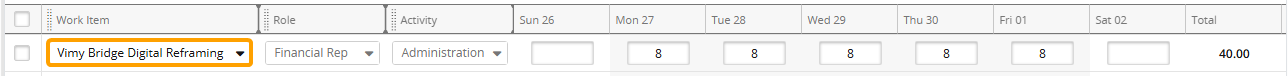 Note: Users can select the same work item for multiple lines on the same Timesheet if a different Activity and/or Role is selected for each one. When this happens, it is also displayed as multiple rows on the Actual Costs page.