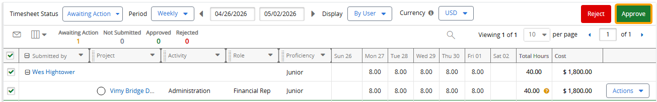 Tip: The "Cost" column on the Manage Time page offers a preview of the actual labor cost of each submitted Timesheet. Time approvers should review the potential labor costs to ensure that time entry errors do not result in inaccurate Actual Costs.
