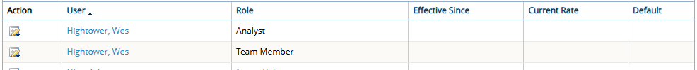 Two roles appear for him on the page because the "Analyst" and "Team Member" roles have been added to his profile. However, neither of these Personal Rates have an actual "Current Rate" associated with them. Therefore, Wes' rate on the Actual Costs page will rely on the work item's designated Rate Table instead (see above).Personal Rates are applied to actual labor costs in the following scenarios: