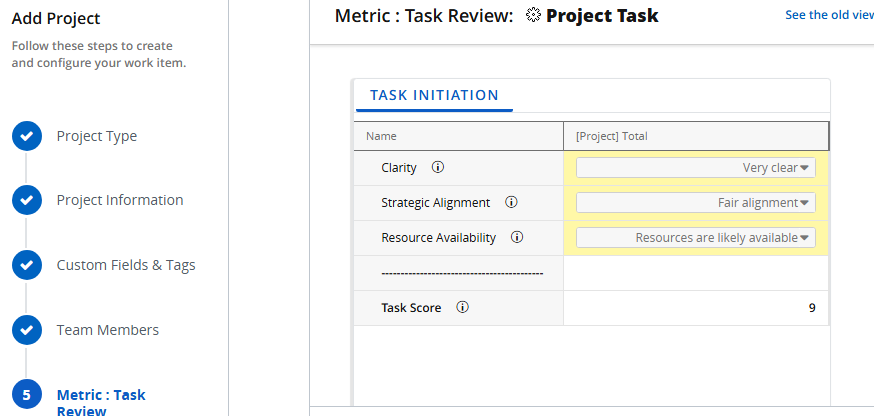When it is time to evaluate the Project, a user can open up the "Project Review" Scorecard Metric on a work item and choose the appropriate values for each criterion: