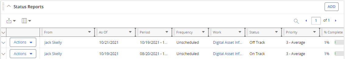 Note: Ensure that the Project Status and % Complete have been updated prior to clicking Add ; they cannot be edited in the Status Report.