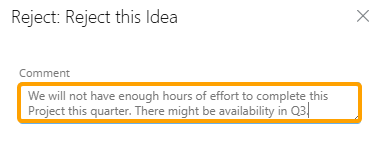 Tip: This is an opportunity to explain why the Idea was rejected and provide any criteria that the Idea must meet to receive approval.