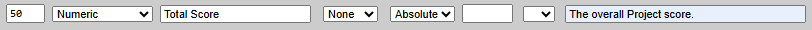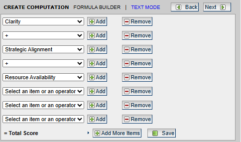 Example: To create a simple formula that adds up the scores of each criteria for the final score, use the drop down menus to select each line item as well as "+" between each one.