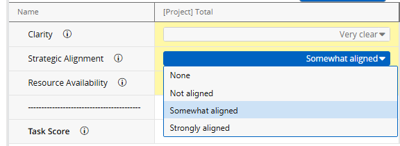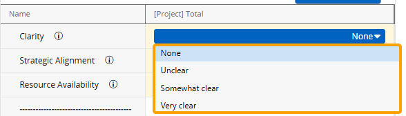 Example: Marilyn's organization wishes to evaluate Projects on three criteria to ensure they are running smoothly: clarity, strategic alignment, and Resource availability. To accommodate this, Marilyn creates a "Project Review" Scorecard Metric that can be used to evaluate Projects. She associated it with the "Project" Object Type, which means it will automatically appear on all work items created from it.