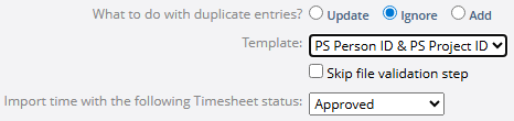 Ignore: Time entries in the import file will NOT replace any duplicate entries that exist on the Timesheet. The existing Timesheet entries will remain in place and any duplicate entries from the fil will be ignored.