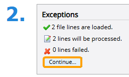 (Optional) Select error log from the "Exceptions" panel to download a .txt version of your upload file with explanations of any failed line items.
