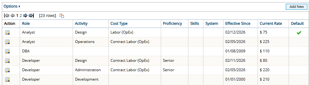 Rate Tables associate Resource assignment components (Default Activity, Roles, and Resource attributes) with hourly rates. When a Resource assignment matches all the criteria in a Rate Table row, the corresponding hourly rate is applied. The rate is then used to calculate estimated and actual labor costs.