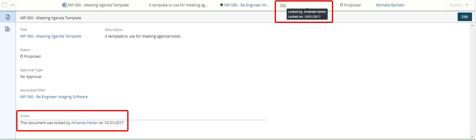 • View lock information in the Notes section of document details. A user can also hover over the "Yes" in the Locked column to view lock information for the document.