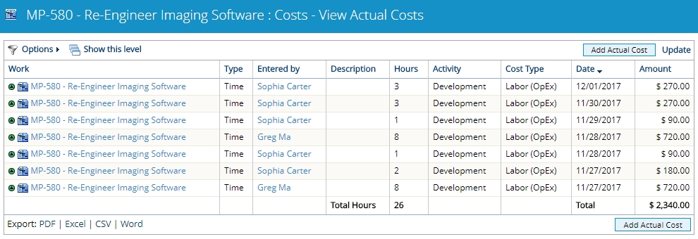Actual costs can be manually entered or uploaded in the cost module, or are automatically created by PowerSteering when timesheet entries are approved and the Time Conversion agent is run.