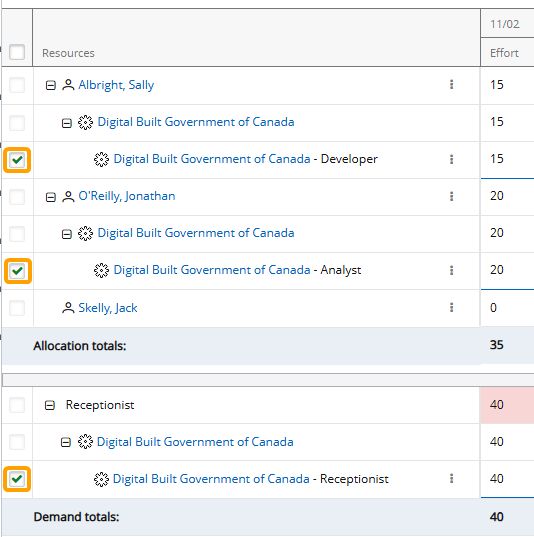 Note: Users cannot assign Resources to work items in bulk to both the Allocation section and the Demand section at the same time using the legacy Resource Review interface. When Allocation section work items and Demand section work items are both selected, the Resource will only be assigned to the work items from the Demand section.