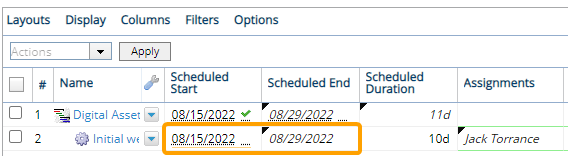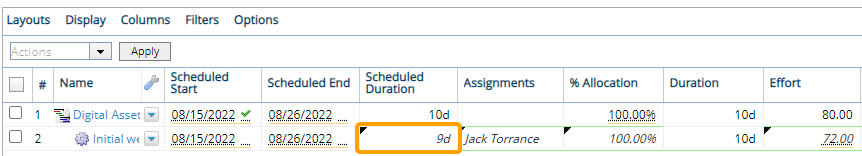 For example, imagine a Project Task that has a Scheduled Duration of 10 days (2 working weeks) from August 15th to 26th. This requires a total of 80 working hours across all 10 days. As we can see in the image above, Jack Torrance only has 72 available hours. This is because he has a personal day off on his own Resource Calendar separate from the Work's calendar. If we decide to add Jack anyway, we will see that the Project's duration will change to accommodate him: