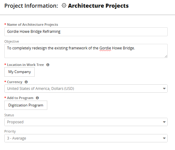 Note: The "Currency" drop-down menu is an optional feature that can be enabled by PowerSteering. If it is not enabled, the new Project will automatically inherit whichever currency is associated with its parent in the Work Tree. However, a Project's currency can be changed at any point after creation.