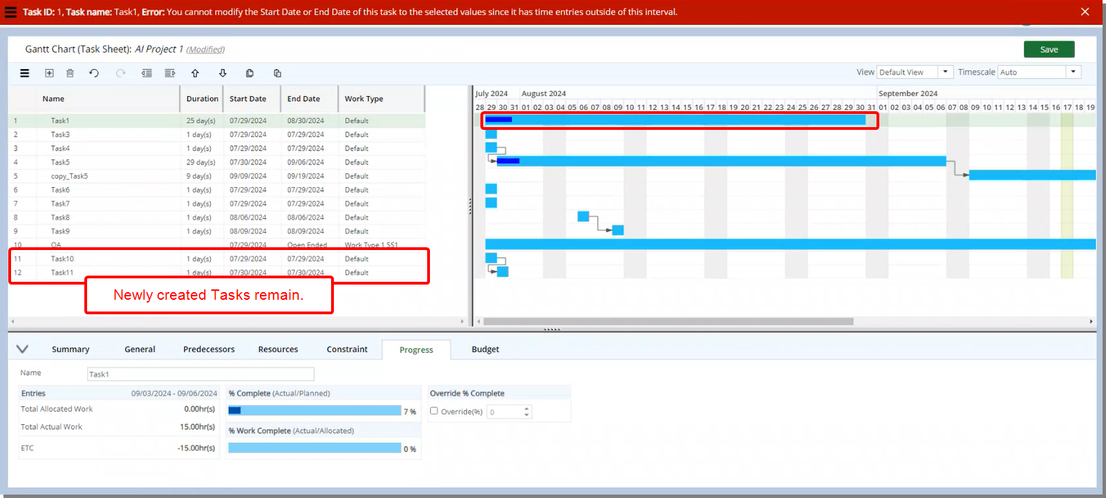 Description: In previous releases, when an error occurred during the saving process in Upland Project Planner, the system would refresh the page, causing you to lose all unsaved changes. The page refresh not only caused downtime but also increased the likelihood of errors, as you had to correct issues without the benefit of seeing your recent modifications.