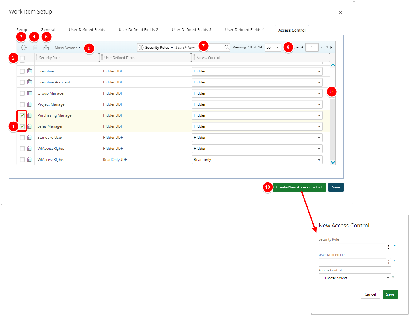 Description: It is now possible to define access limitations to User Defined Fields associated with Work Items based on Security Roles. Within the new Access Control tab, you can now choose to either hide or bar users from editing/updating the associated User Defined Field(s).