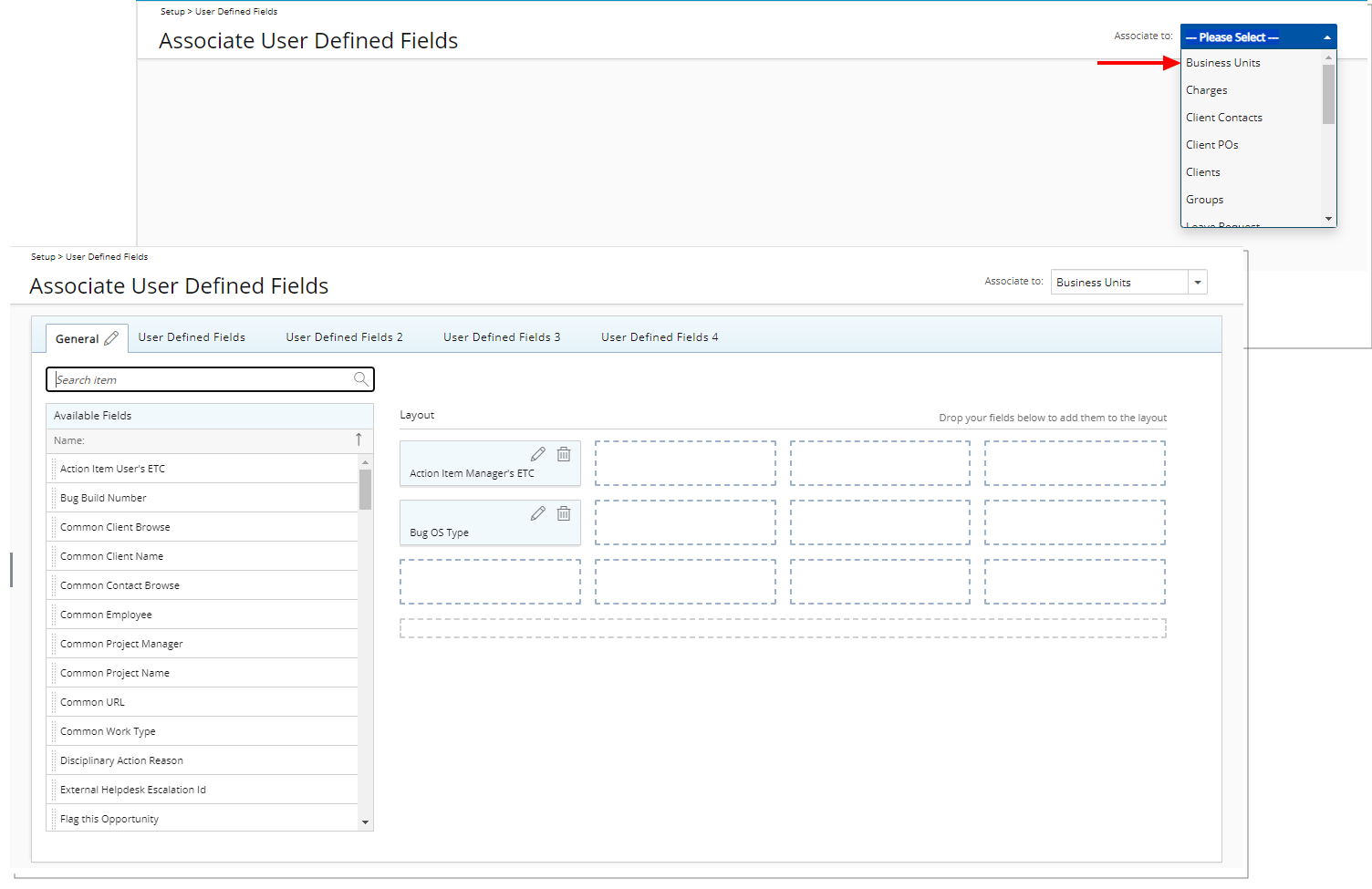Description: You can now associate User Defined Fields (UDFs) directly to Business Units via the Associate User Defined Fields page (Setup). This is achieved by selecting the new Business Units option from the Associate to selection list.