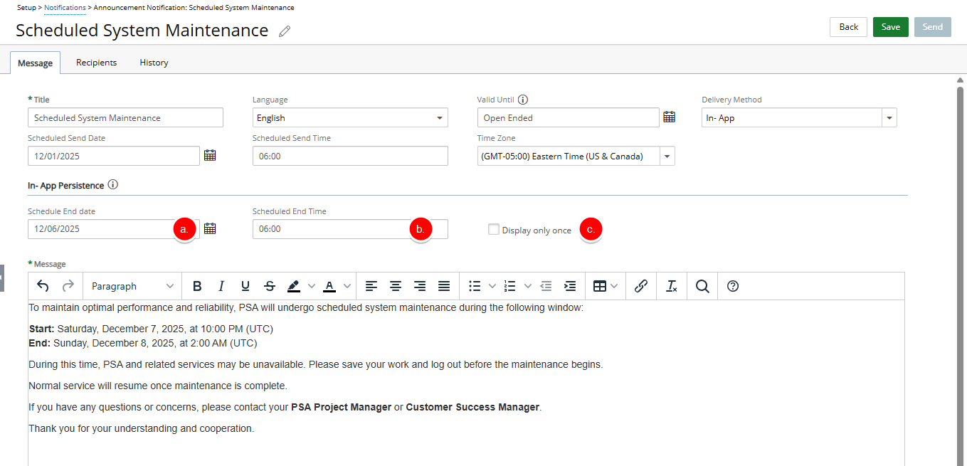 - Scheduled End Date:The date when the announcement will stop appearing to users in the application.