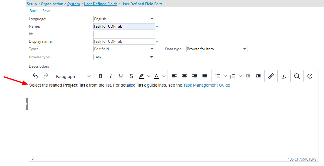 - Enter any additional information in the Description field. Use this field to provide context or guidance for the User Defined Field (UDF). The Rich Text Editor supports text formatting such as bold and italic, as well as hyperlinks. (Images and tables are not supported.)