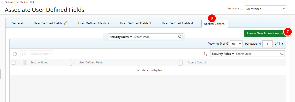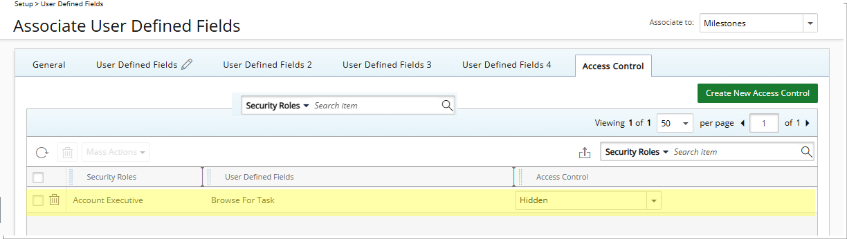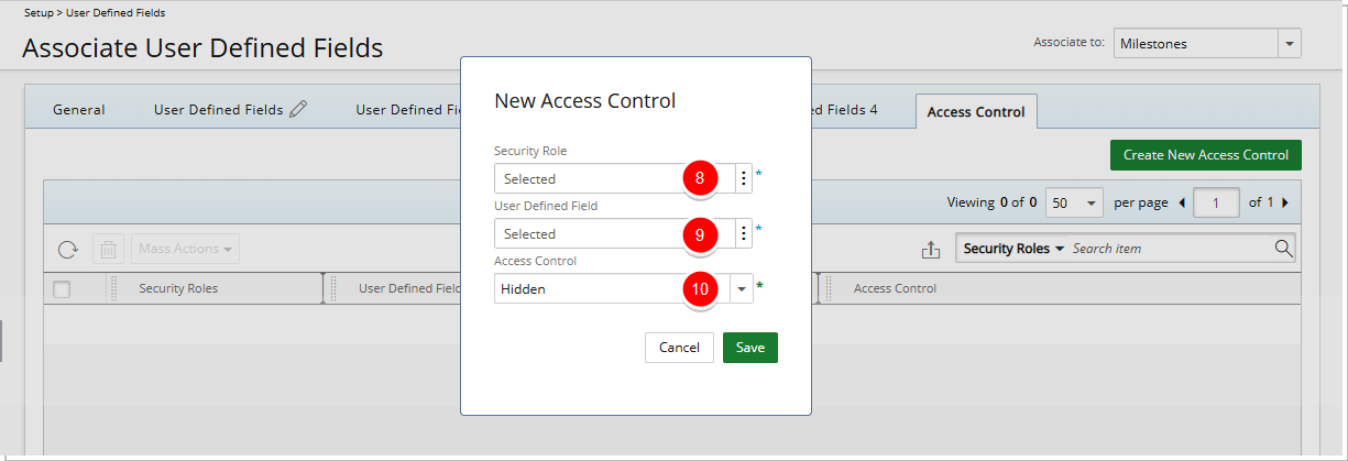 Access limitations can be defined for User Defined fields associated with Milestones based on Security Roles. Within the Access Control tab, you can choose to either hide the associated User Defined Field(s) or bar users from editing/updating them.
