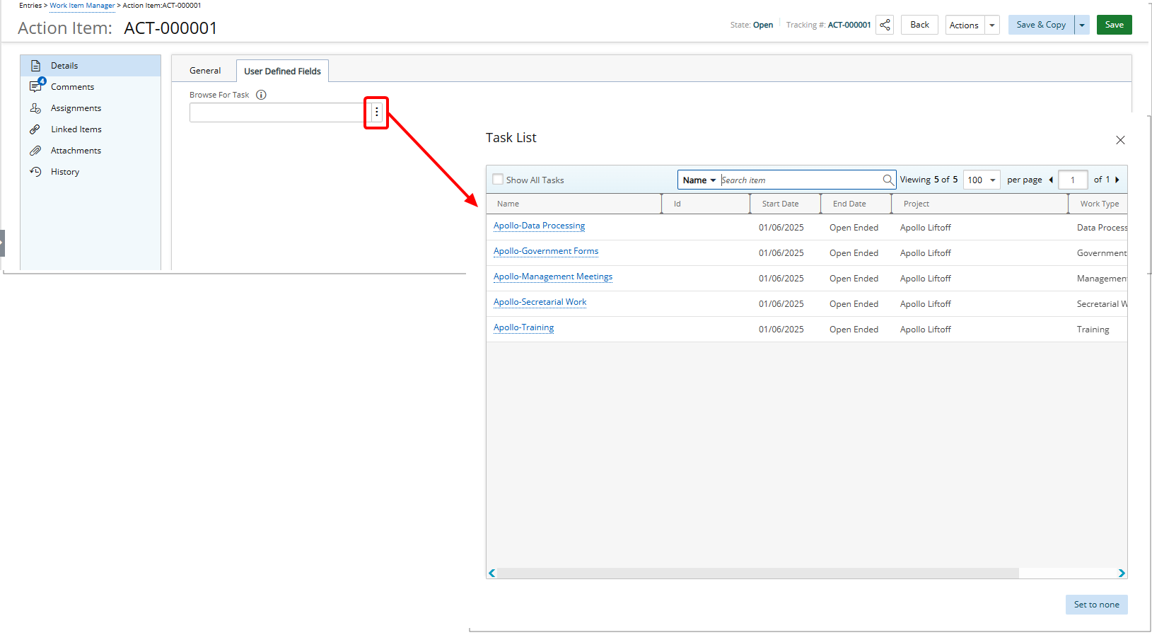 Note: When the Project field is not included in the Work Item layout, any Work Item Entry created is automatically associated with the System Default Project. In this scenario, if a User Defined Field (UDF) of the Browse for Task data type is present and the Display only Project Tasks option is enabled, the Task list will show tasks from the System Default Project. This is expected behavior, as the system uses the available project context to determine which tasks to display. To ensure the correct project's tasks are shown in the UDF, include the Project field in the Work Item layout so that the Work Item can be explicitly tied to the appropriate project at creation.