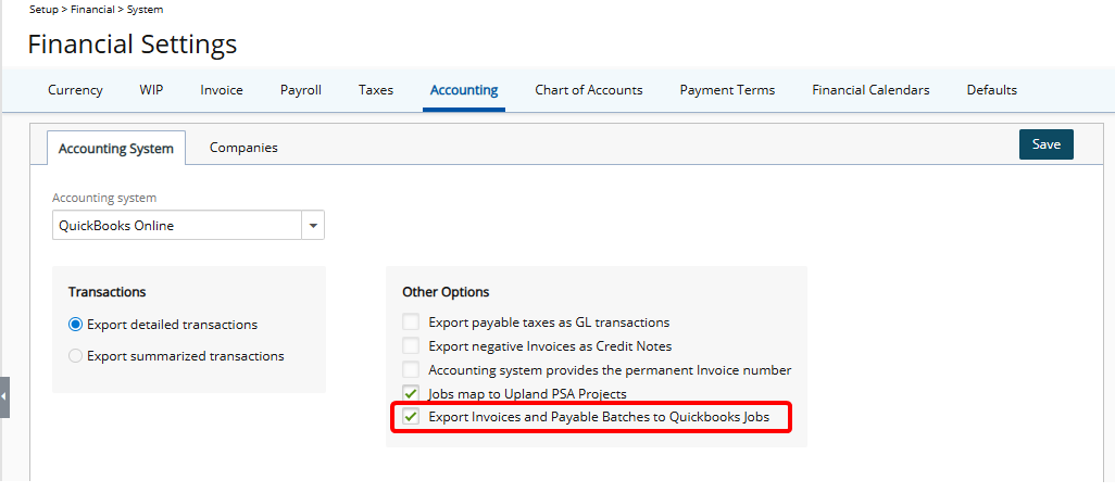 Prerequisite: The Jobs map to Upland PSA Projects option must be enabled at the Accounting System level (Setup > Financial > System > Accounting) for the Projects map to QuickBooks Jobs option to become available. If this setting is not enabled, the new option will remain disabled and unchecked.