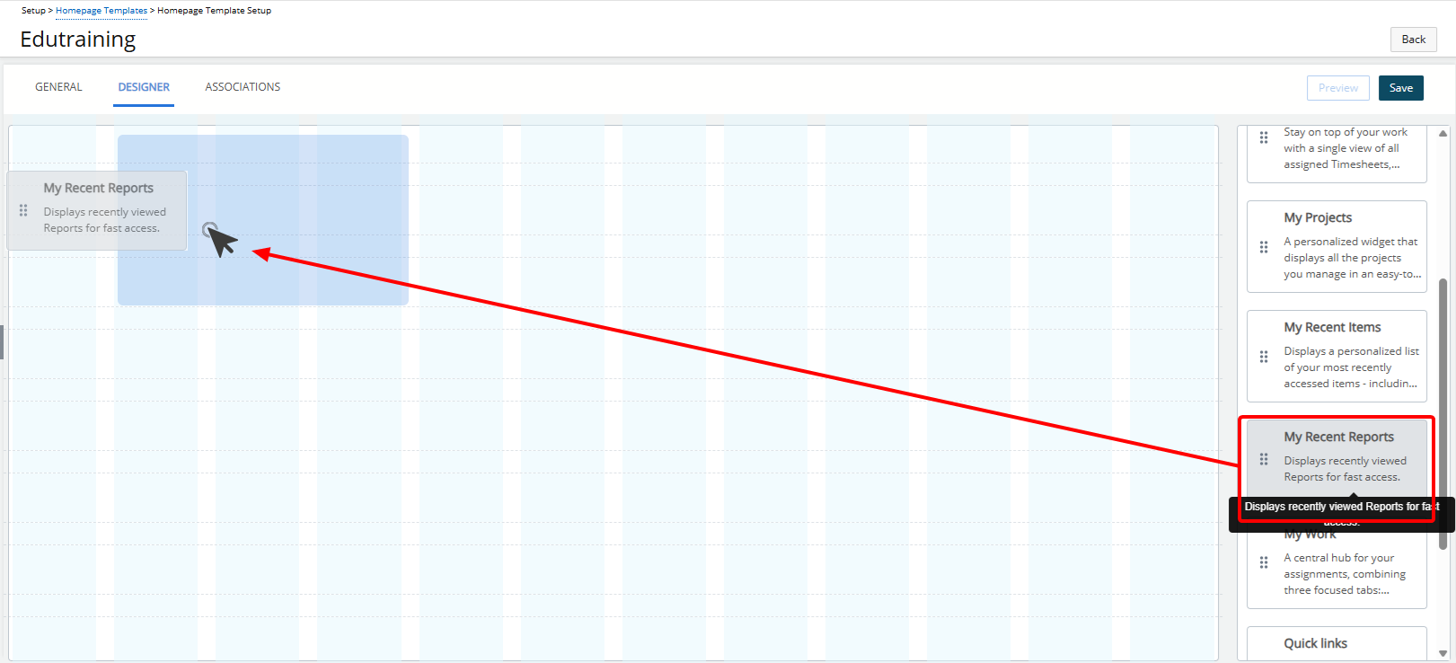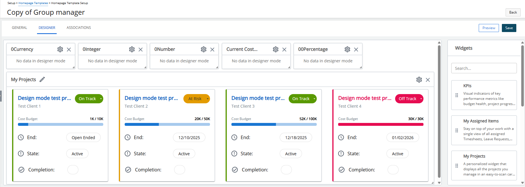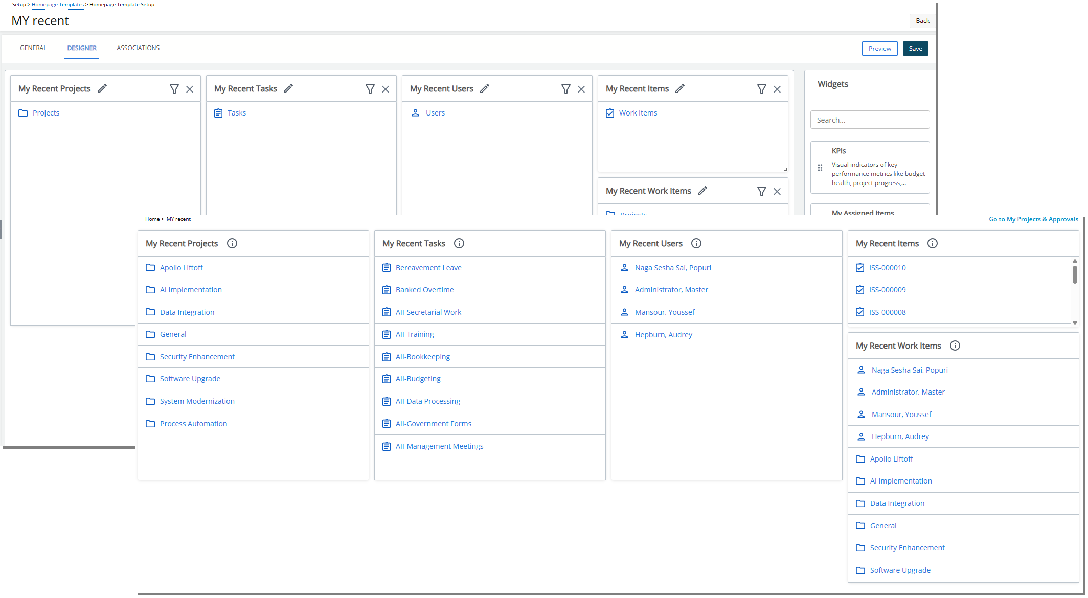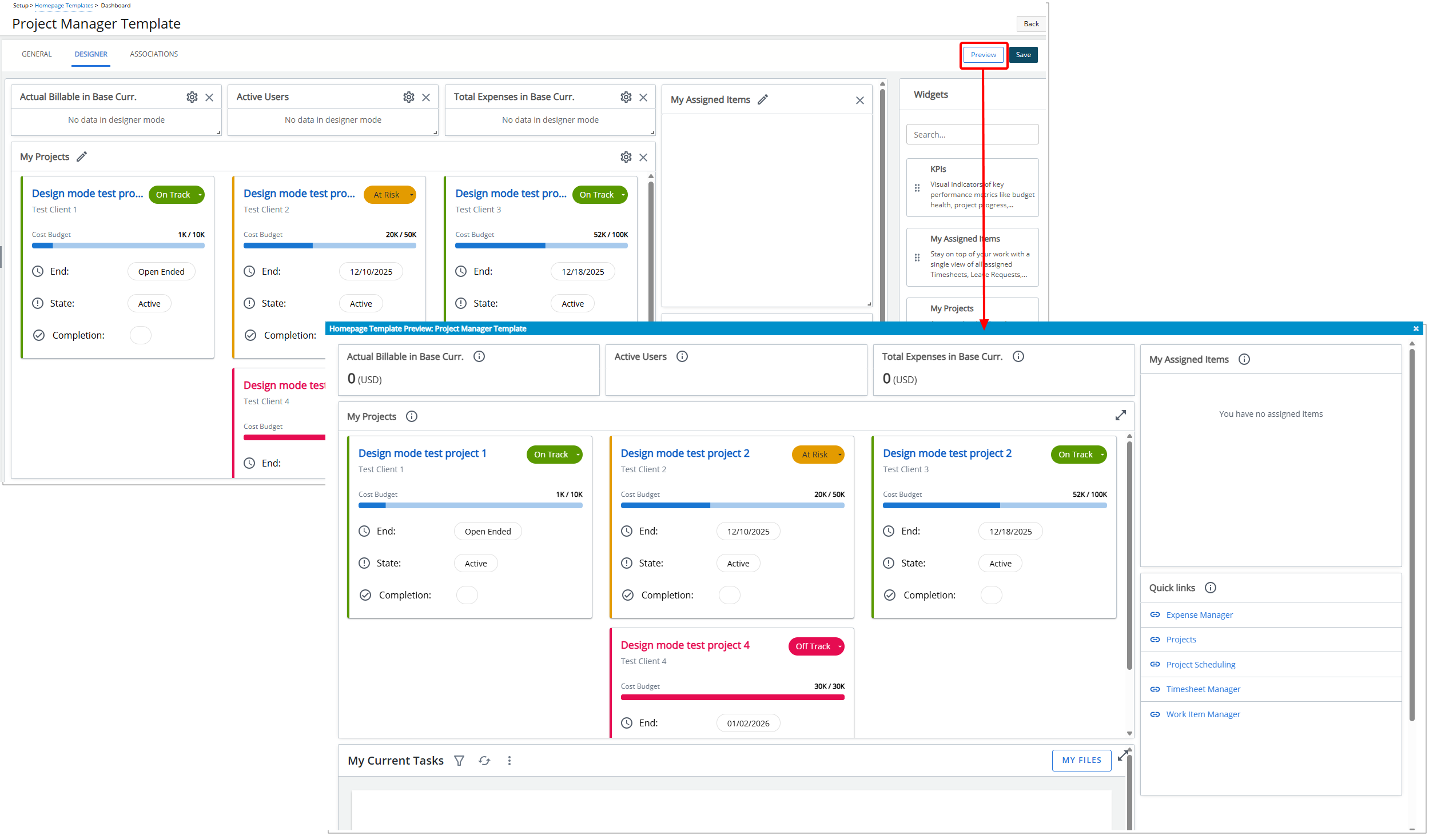 Description: In the previous release, administrators configuring Homepage Templates in the Designer tab had no way to preview the layout and widget setup before publishing. This often made it difficult to verify the visual arrangement, widget behavior, and KPI or filter configurations, requiring multiple edits and republishing to ensure the page appeared as intended.