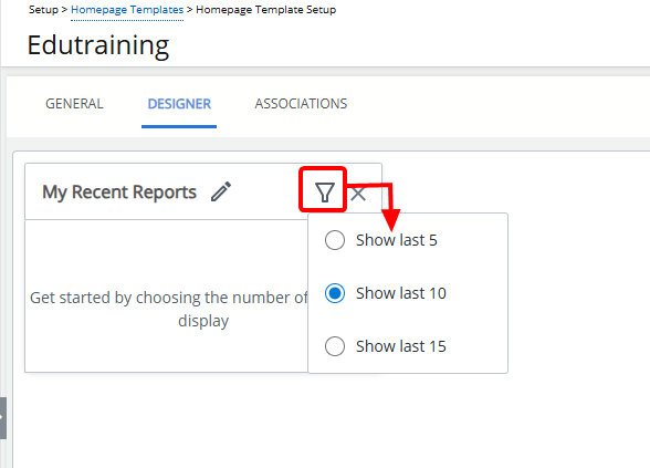 The My Recent Reports tile provides you with quick access to the reports you use most often, displaying up to 5, 10 (default), or 15 recently visited reports in descending order by last visited time.