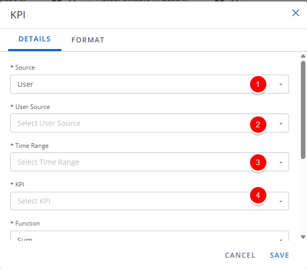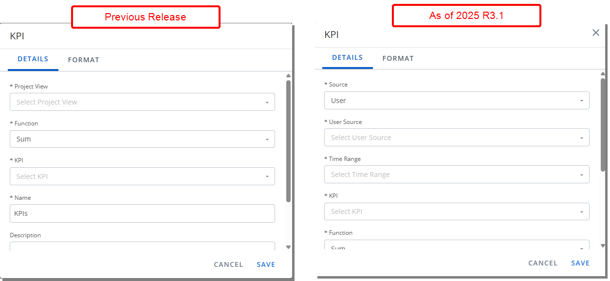Note: All other configuration fields and available options—such as Time Range, Function, Name, and Description—remain unchanged. These settings continue to operate exactly as before and will apply to the KPI according to the selected Source (whether Project or User).