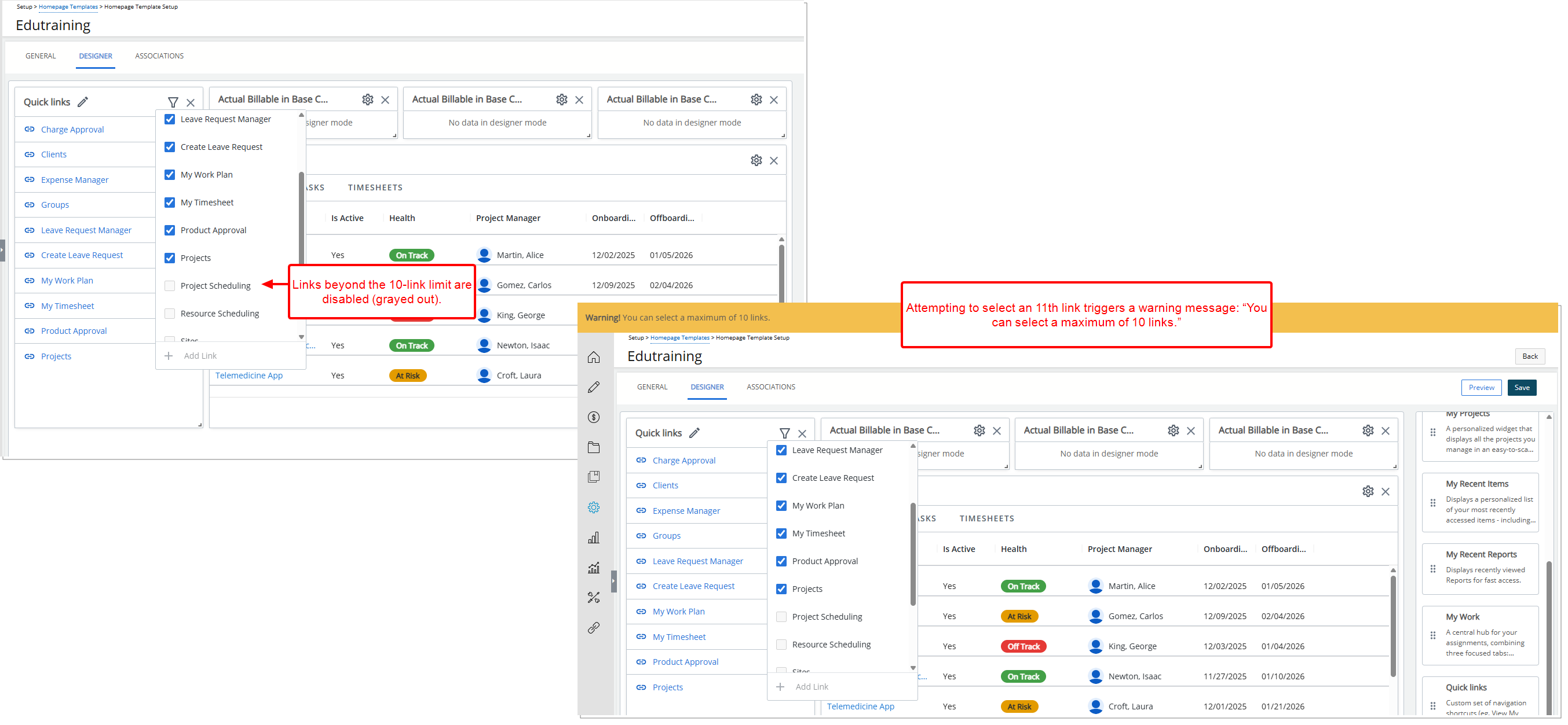 Description: In the previous release, when configuring the Quick Links Widget, a warning message appeared immediately upon selecting the 10th link, even though the user was still within the allowed limit. This caused confusion, as the warning appeared prematurely and all remaining link options were disabled before the user attempted to exceed the limit.