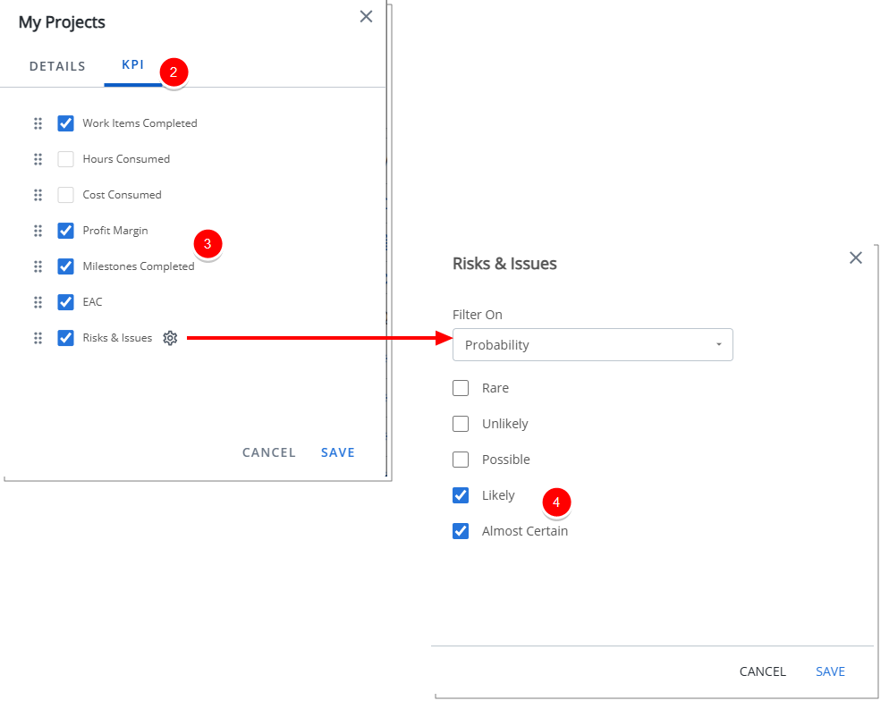 Actual hours + remaining Forecasted hours. - Risks & Issues - Displays the count of Risks and Issues on the project that require attention. When Risks & Issues is selected, click the Settings icon to configure the KPI filter. Choose the applicable filter type—such as Priority, Probability, or Severity—and then select the desired values: