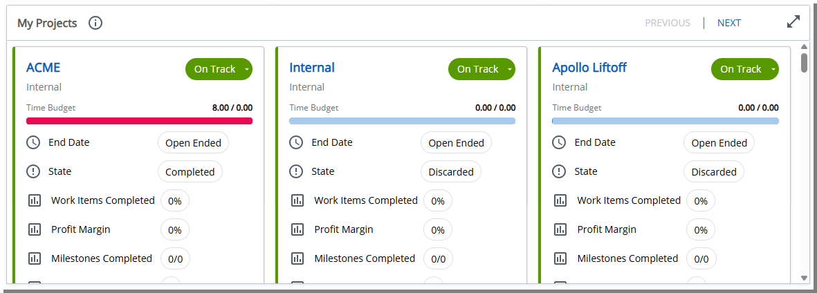 Description: In previous releases, the My Projects widget displayed only a limited, fixed set of KPIs on each project card, with no ability for administrators to select additional KPIs or control their order. This restricted at-a-glance visibility into key project metrics and required users to navigate elsewhere for deeper insight.