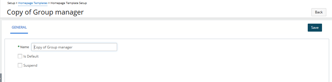 - On the General tab, you can update the template Name and adjust the Is Default or Suspend options.