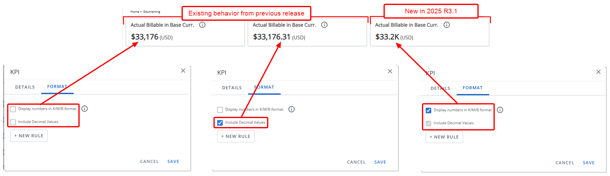 Description: In previous releases, KPI values were always shown in full numeric form. While accurate, this formatting made large numbers harder to quickly read and interpret—particularly for dashboards that surface high-volume metrics such as revenue, hours, or record counts in the thousands, millions, or higher. Without a short-format option, users often needed to pause and visually parse long numbers, reducing the at-a-glance value of the KPI tiles.