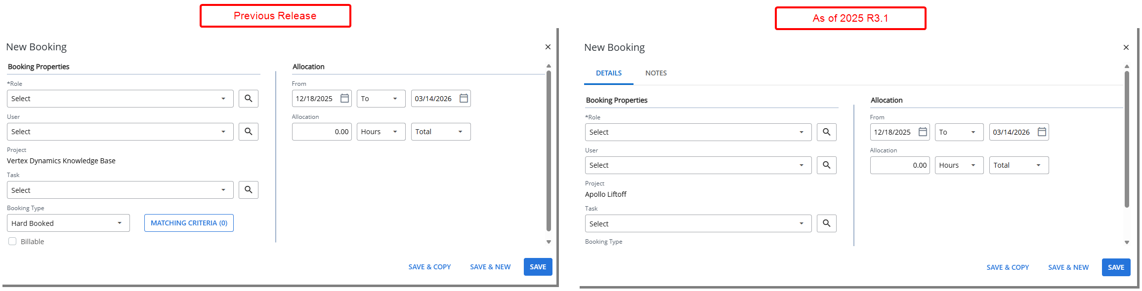 With this release, a Notes tab has been added to the New Booking dialog box, allowing Resource Managers to add a Note prior to saving a new Booking.