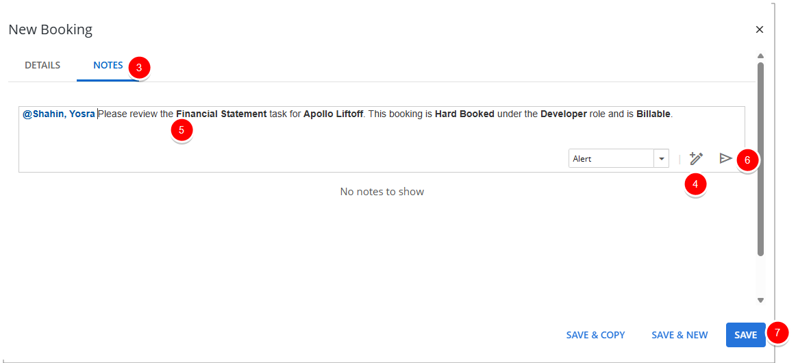 to save the note and send notifications to mentioned users. You can add additional notes by repeating steps 5 and 6 as needed, or edit or delete a saved note. - Click Save to save the booking and close the New Booking dialog box.