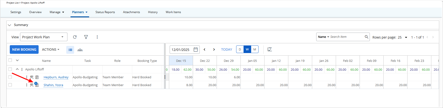 - When the Work Plan refreshes, you will see your new booking line with a counter on the Note icon, indicating that your note has been saved.