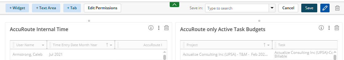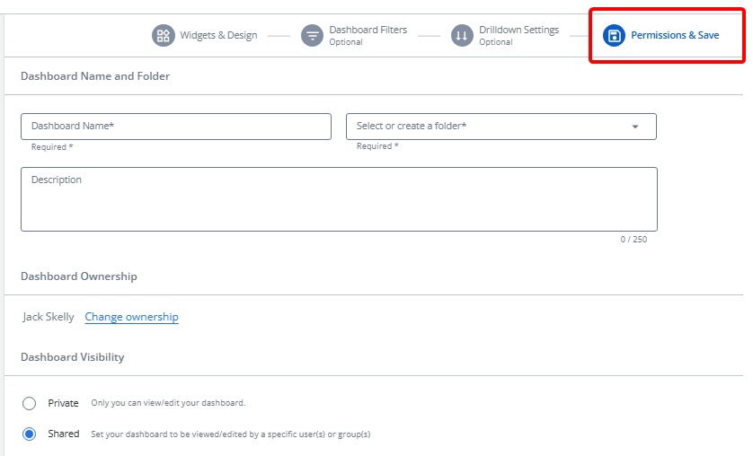 Finally, users can select Permissions & Save to name and save their Dashboard, as well as determine who has access to it.