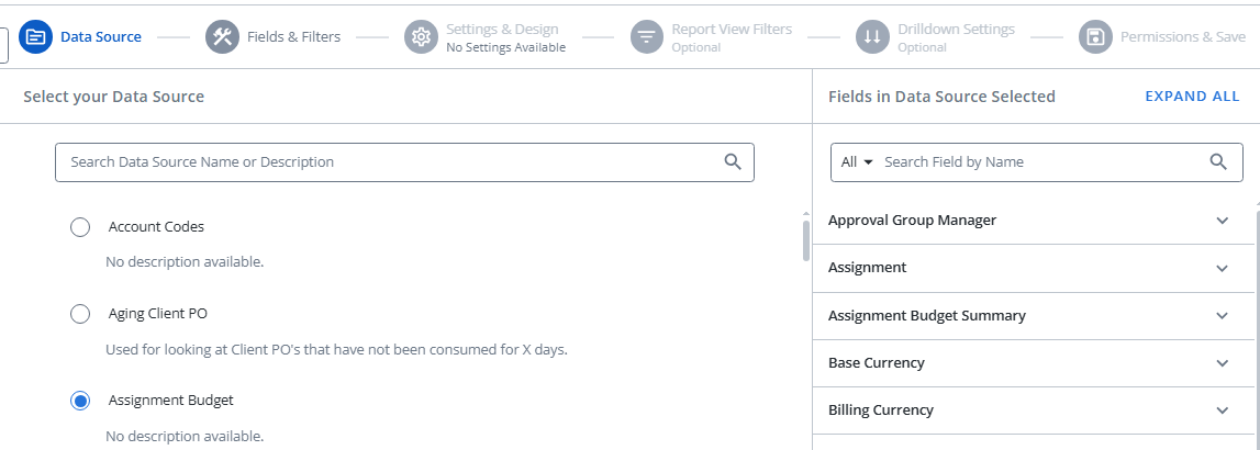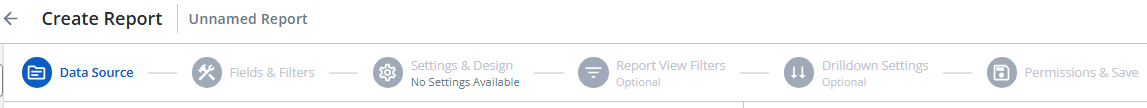 Tip: The Data Views and fields available for the selected Data Source will be previewed on the right-hand side of the page. This allows report builders to validate that they have selected the correct Data Source before moving on to the next step.