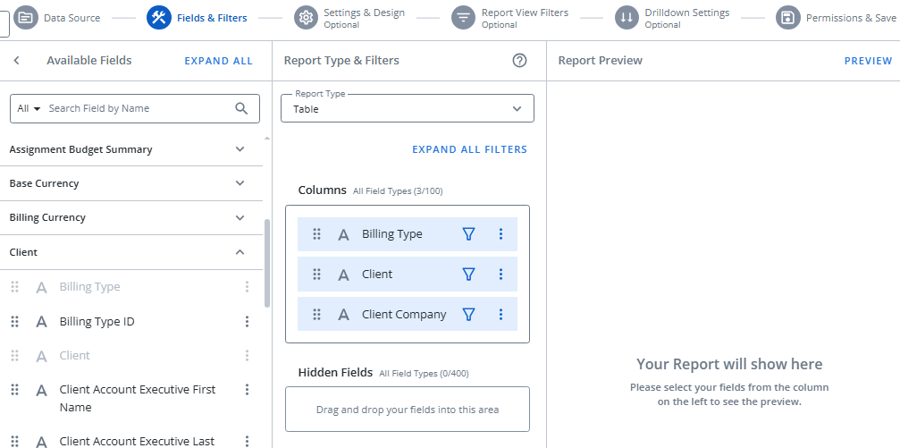 Users can select Fields & Filters or the Next button to determine the fields that will be displayed on their report, as well as the report type. Just like in the classic version, filters can be added to each selected field.
