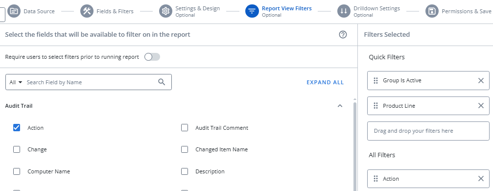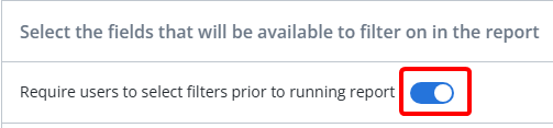 Tip: Toggling "Require users to apply filters before running report" will ensure that users apply at least one filter to the report before running it.