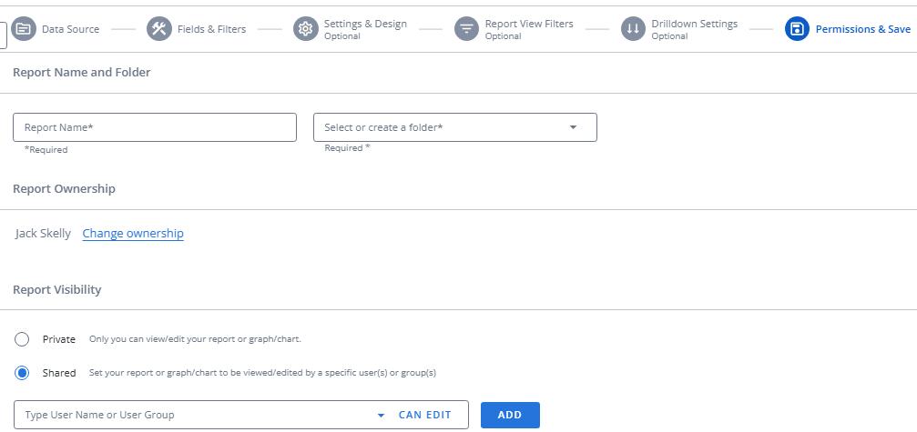 Finally, users can select the Set Permissions & Save button to name and save their report, as well as determine who has access to it.